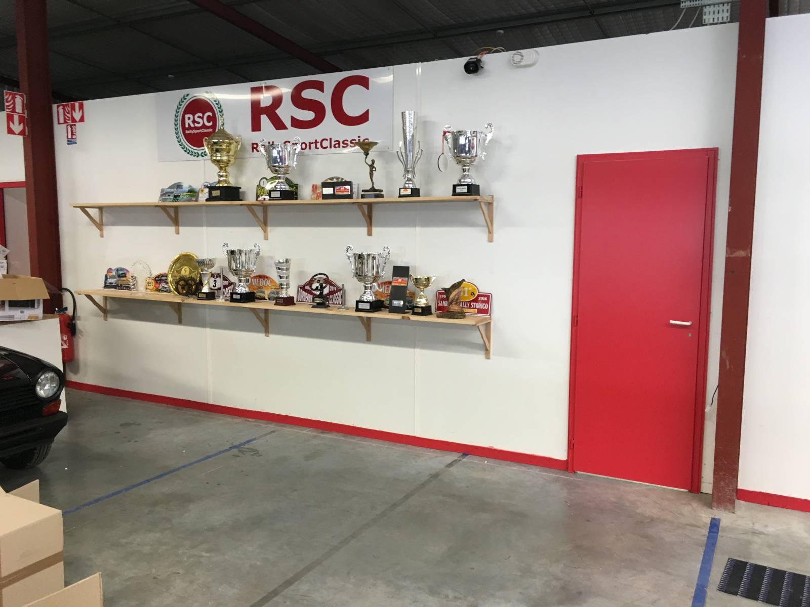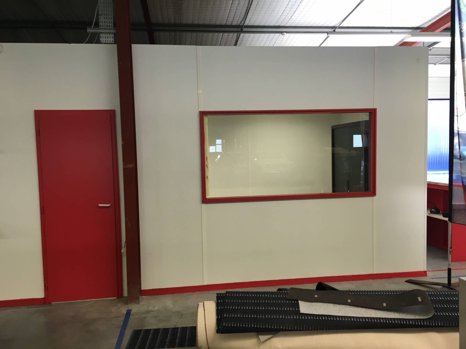 Le client a opté pour des murs en Mélaminé Blanc, un chassis fixe simple vitrage, et une porte en bois que l'on a peinte en rouge (couleur de l'enseigne).