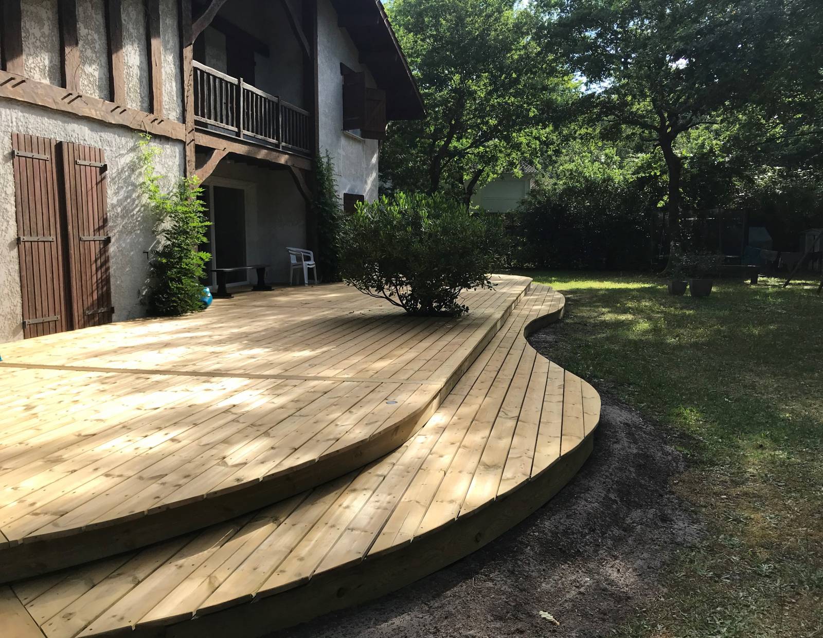 Construction d'une terrasse en Pin avec des arrondis sur LACANAU