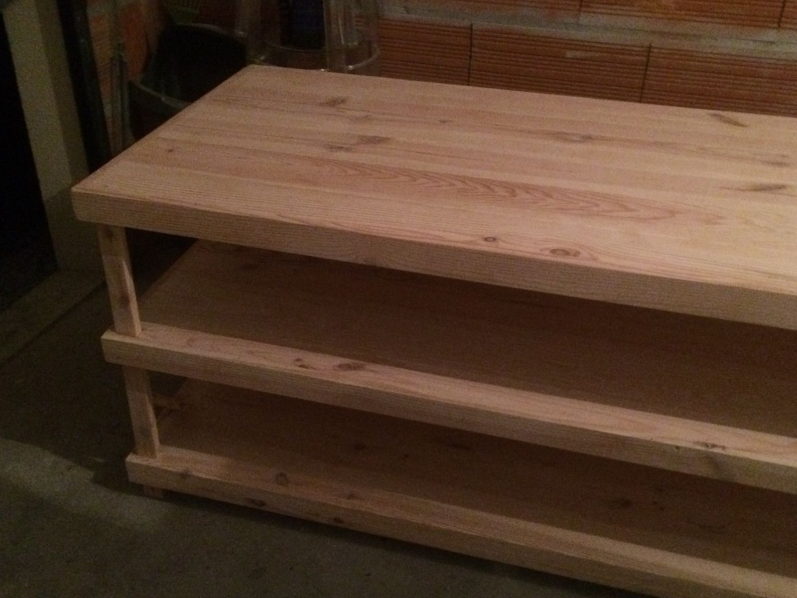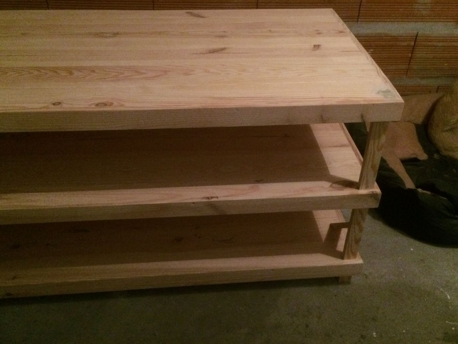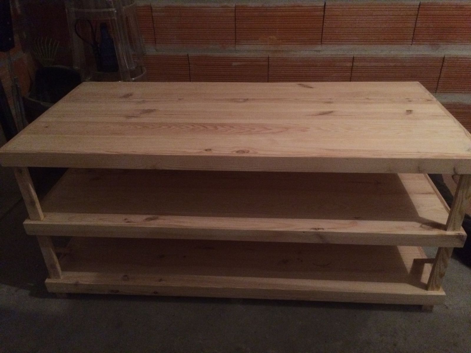 Un de nos clients professionnels, nous a commandé une table en bois sur-mesure avec 3 étagères pour son magasin. Pour fabriquer cette table, nous avons utilisé des lames de parquet en essence de Pin.