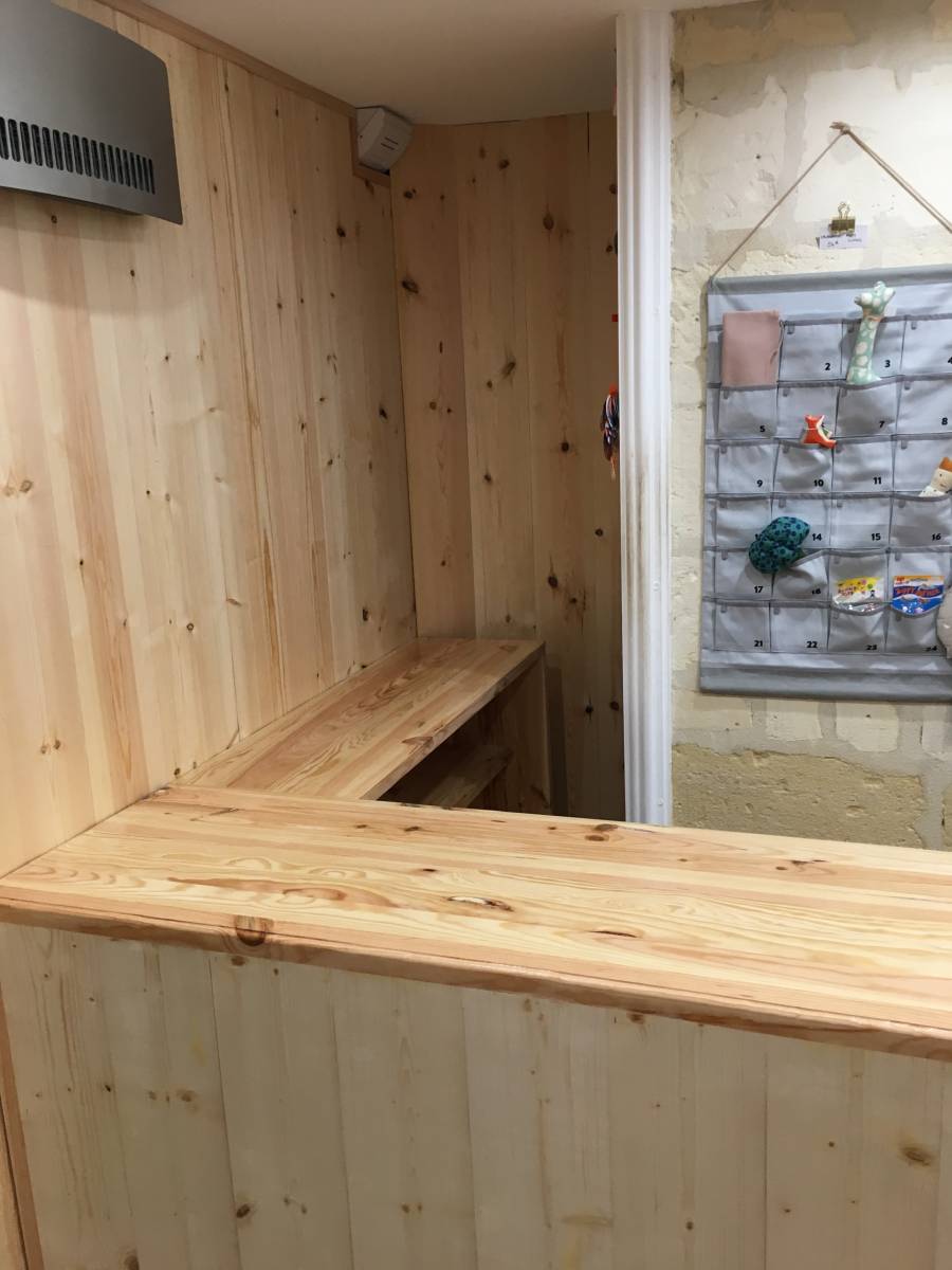 Pour un de nos clients professionnel, nous avons du réaliser un comptoir en bois sur mesure, ainsi que la pose de lambris en bois naturel sur un mur de son magasin situé sur l’agglomération de Bordeaux..