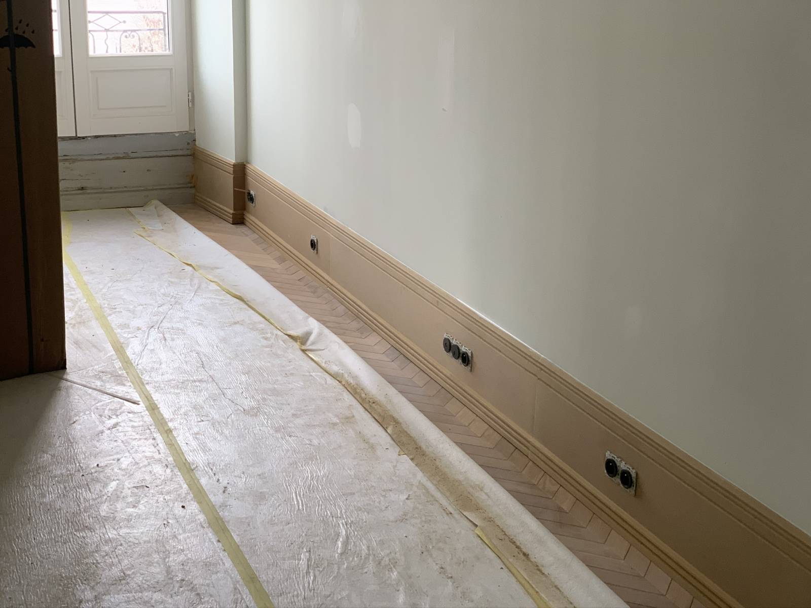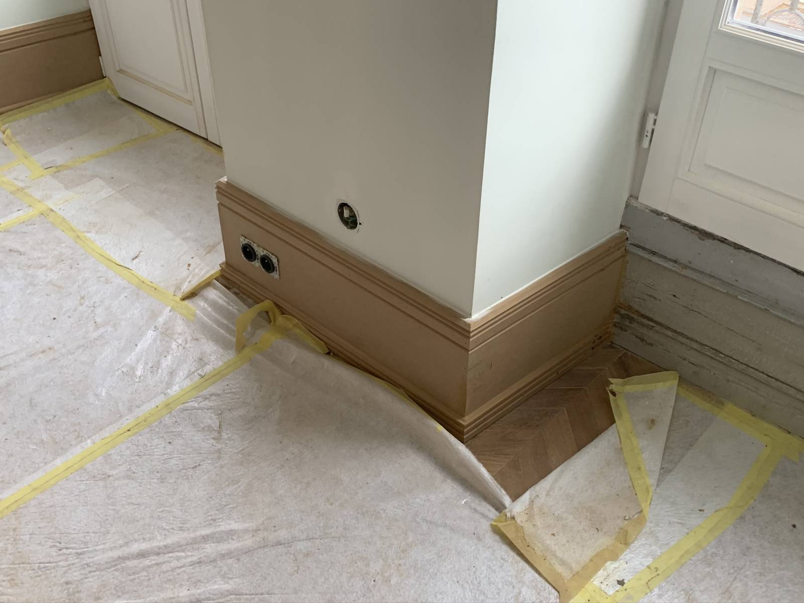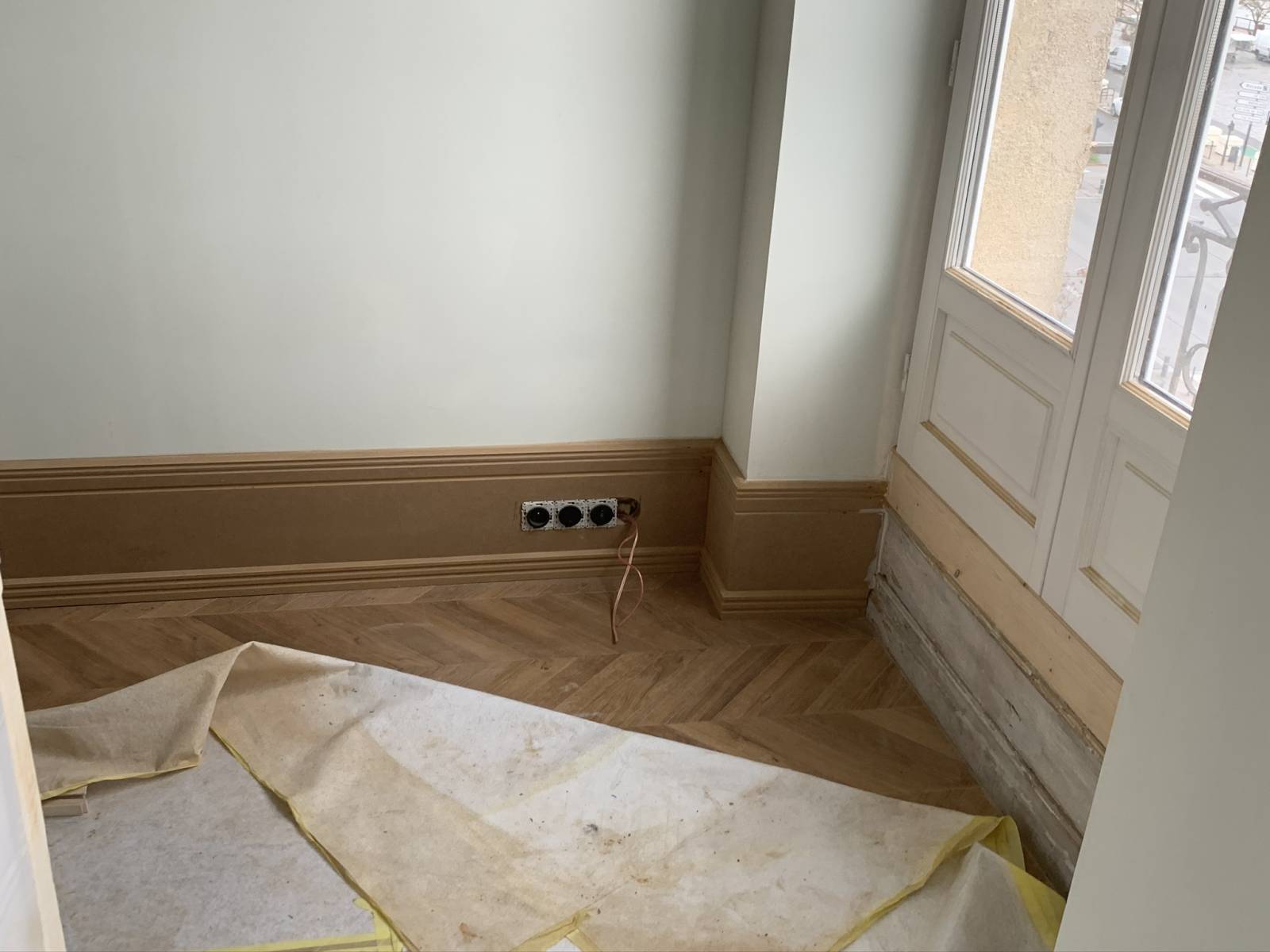 Pour un de nos clients, nous avons réalisé des plinthes en bois sur mesures pour son appartement. Notre client devait absolument mettre des plinthes en bois identique à l’original, car l’appartement dépend des bâtiments de France. Pour ce faire, nous avons donc utilisé du Médium en 15 cm d’épaisseur, pour faire des plinthes de 38 cm de haut.