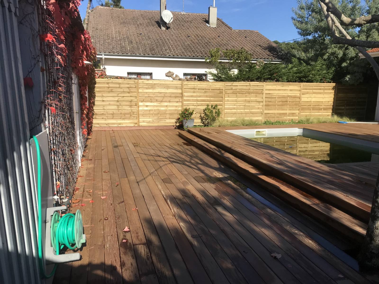 Pour un de ses clients, l’entreprise LEPAGE CYRIL a réalisé une terrasse en bois exotique avec des marches, plus précisément en IPE. Notre client souhaitait de l’IPE car il est imputrescible naturellement.